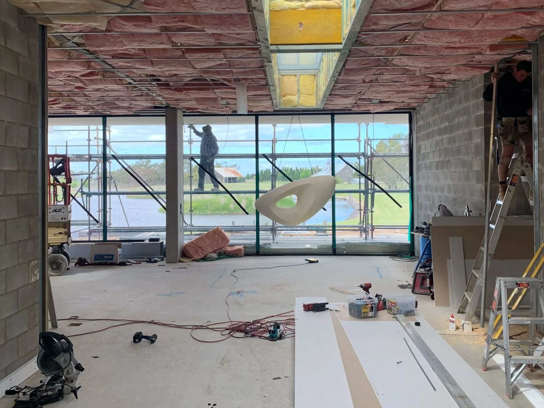 A 400kg limestone monolith, suspended within a lakeside Victorian residence, was engineered to float before an expansive window—anchoring the home to its landscape while embodying millions of years of geological history.